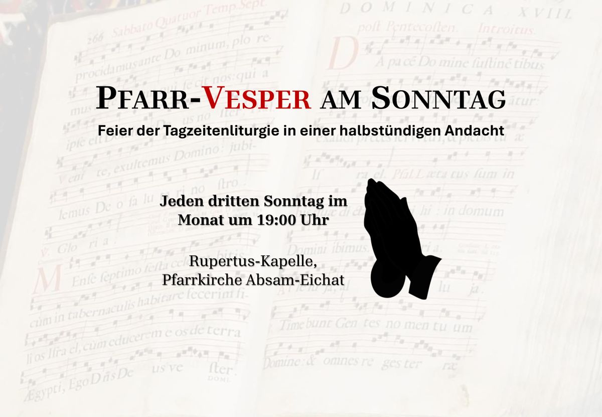 Wir feiern die Tagzeitenliturgie in einer halbstündigen Andacht zum ersten Mal am 19.10.2025 um 18:30 Uhr in der Rupertus-Kapelle in unserer Pfarrkirche in Eichat. In Zukunft laden wir in Eichat jeweils am dritten Sonntag im Monat um 19:00 Uhr zur Vesper ein.